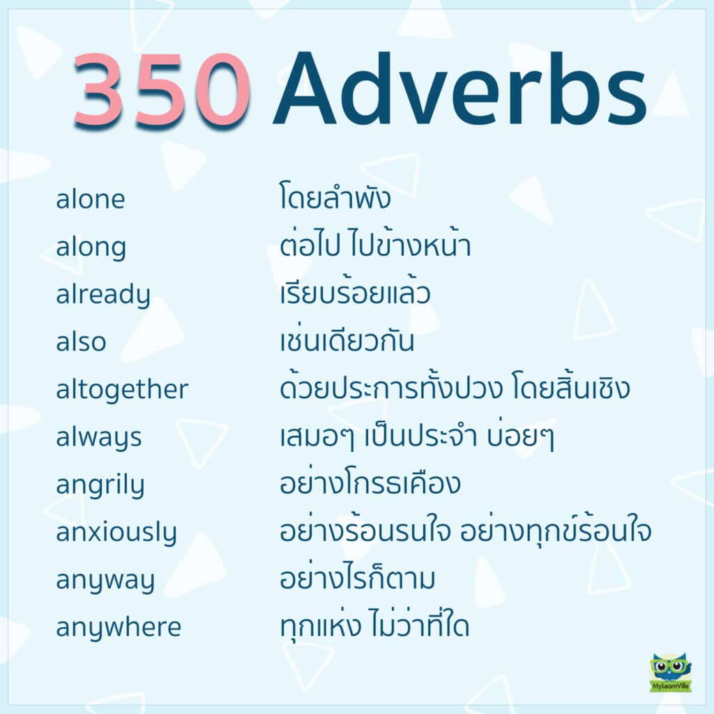 วันนี้เรามาดูตัวอย่างของ Adverbs 350 คำและวิธีการใช้ Adverbs ในประโยคภาษาอังกฤษกันค่ะ