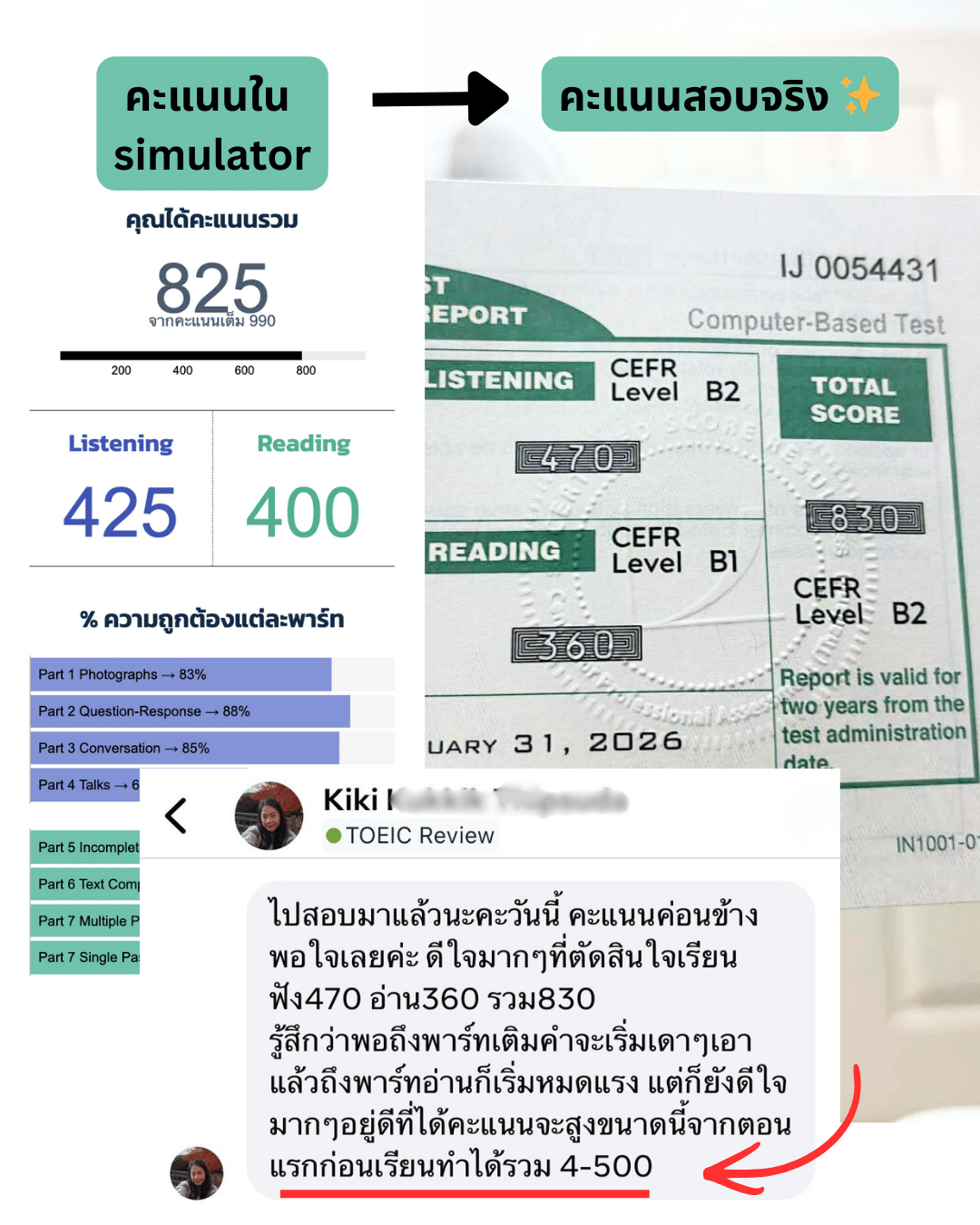 ชอบพวก flashcard ศัพท์ที่คอยเสริมๆระหว่างบทเรียน มันทำให้เราสะดวก ไม่ต้องไปหาเอง แล้วก็เปิดทวนได้ง่าย จำได้ไวขึ้นมากๆ และทุกพาร์ทของข้อสอบ ชอบที่ครูพี่หมีสอนแบ่งเวลา ว่าต้องอ่านอะไรก่อน ดูอะไรบ้าง ในระยะเวลาที่จำกัดมากๆในแต่ละข้อ มันทำให้เราทำคะแนนได้ง่ายขึ้น เพราะเราฟังทัน อ่านทัน รู้สึกว่าข้อสอบมันไม่ได้ยากแบบที่เราเคยคิด คือใช้เวลาติวไม่นาน แต่ก็สามารถทำคะแนน TOEIC ได้เยอะกว่าที่คิดมากๆ ค่ะ